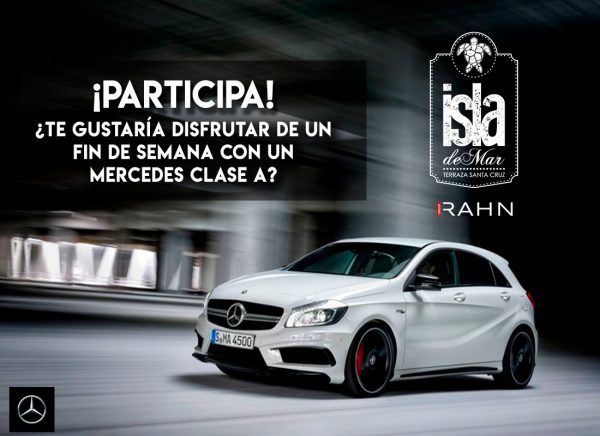 Un placer de la conducción, una sensación de vida para disfrutar. En Isla de Mar, queremos que pruebes un Mercedes Clase A durante todo un fin de semana, y para ello hemos creado un concurso para los fan y seguidores de las páginas oficiales de Terraza Isla de Mar y Mercedes Benz Tenerife, colaborando con Grupo Rahn, en el que podrán participar a través de nuestra página oficial de Facebook. El concurso tendrá una duración de alrededor de una semana comenzará el día 28 de Septiembre y finalizará el 5 de Octubre la actividad se desarrollará en la zona geográfica de Tenerife.